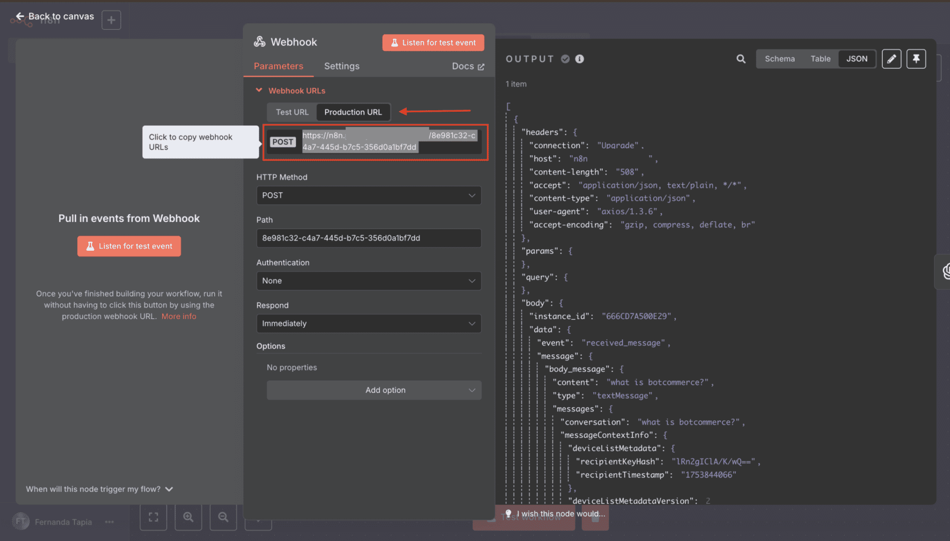 Now it’s time to register the Production URL for the global webhook. Go back to the editor, open the Webhook Trigger step, and copy the Production URL.