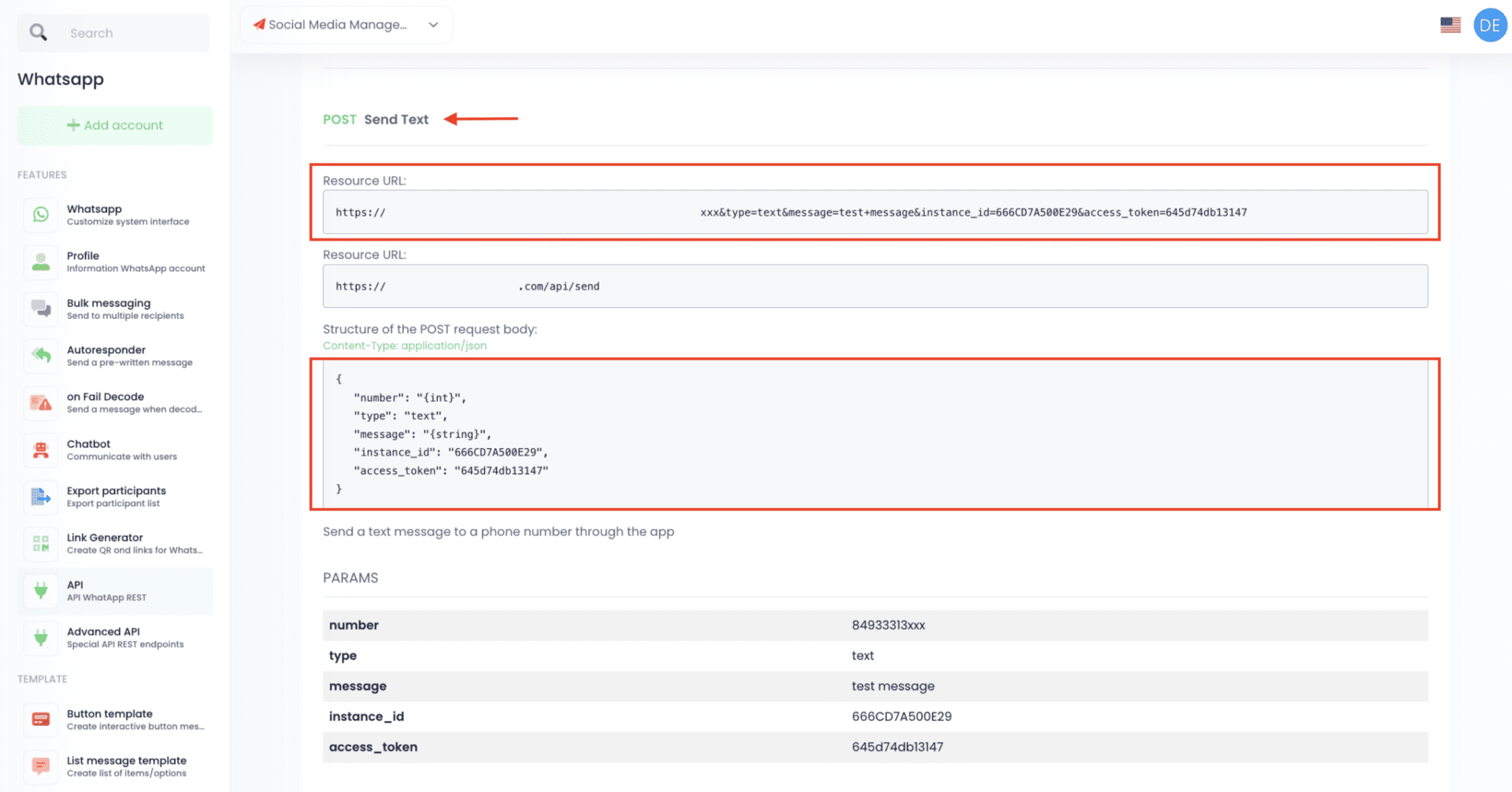 - instance_id: Your WhatsApp session ID